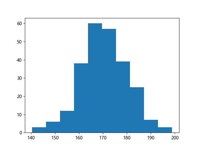 # 以下三行代码使编译器支持绘图功能: import sys import matplotlib matplotlib.use('Agg') import matplotlib.pyplot as plt import numpy as np # 生成正态分布数据: x = np.random.normal(170, 10, 250) # 均值 170,标准差 10,250 个数据点 # 绘制直方图: plt.hist(x) # 创建直方图 plt.show() # 显示图表 # 以下两行代码使编译器能够输出图形: plt.savefig(sys.stdout.buffer) sys.stdout.flush()