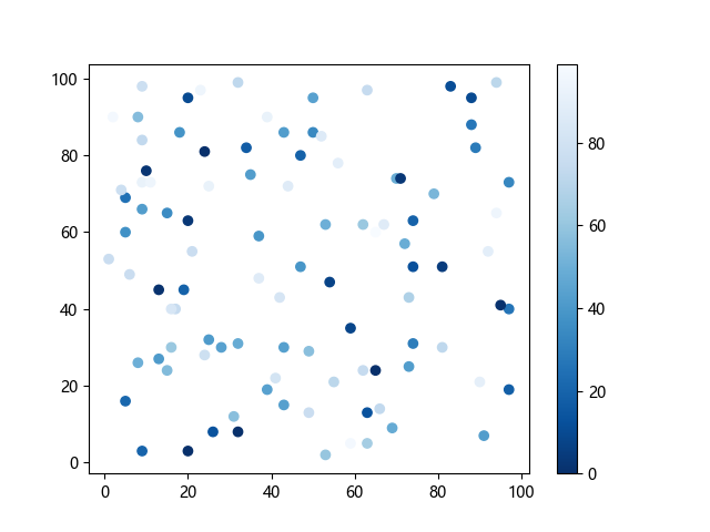 # 这三行代码使编译器能够绘图: import sys import matplotlib matplotlib.use('Agg') import matplotlib.pyplot as plt import numpy as np x = np.random.randint(100, size=(100)) y = np.random.randint(100, size=(100)) colors = np.random.randint(100, size=(100)) # 使用反向蓝色渐变绘制散点图: plt.scatter(x, y, c=colors, cmap='Blues_r') plt.colorbar() # 显示颜色条 plt.show() # 显示图形 # 这两行代码使编译器能够输出图形: plt.savefig(sys.stdout.buffer) sys.stdout.flush()