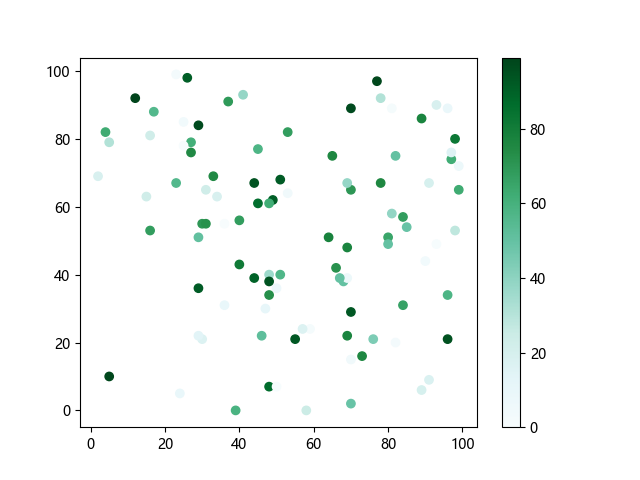 # 这三行代码使编译器能够绘图: import sys import matplotlib matplotlib.use('Agg') import matplotlib.pyplot as plt import numpy as np x = np.random.randint(100, size=(100)) y = np.random.randint(100, size=(100)) colors = np.random.randint(100, size=(100)) # 使用蓝绿色渐变绘制散点图: plt.scatter(x, y, c=colors, cmap='BuGn') plt.colorbar() # 显示颜色条 plt.show() # 显示图形 # 这两行代码使编译器能够输出图形: plt.savefig(sys.stdout.buffer) sys.stdout.flush()