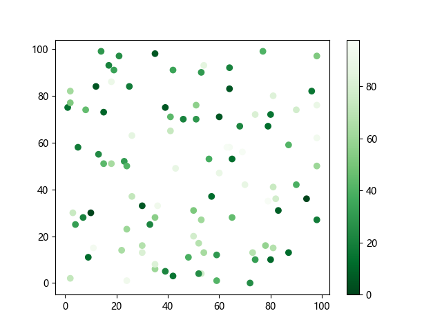 # 这三行代码使编译器能够绘图: import sys import matplotlib matplotlib.use('Agg') import matplotlib.pyplot as plt import numpy as np x = np.random.randint(100, size=(100)) y = np.random.randint(100, size=(100)) colors = np.random.randint(100, size=(100)) # 使用反向绿色渐变绘制散点图: plt.scatter(x, y, c=colors, cmap='Greens_r') plt.colorbar() plt.show() # 这两行代码使编译器能够输出图形: plt.savefig(sys.stdout.buffer) sys.stdout.flush()
