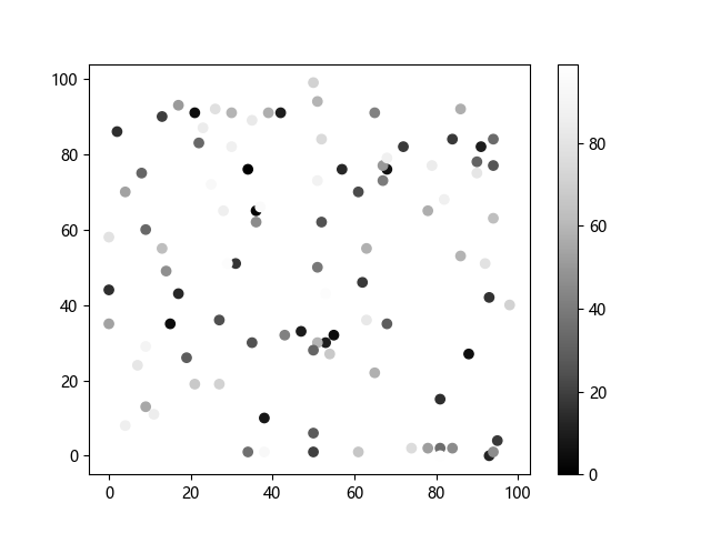 # 这三行代码使编译器能够绘图: import sys import matplotlib matplotlib.use('Agg') import matplotlib.pyplot as plt import numpy as np x = np.random.randint(100, size=(100)) y = np.random.randint(100, size=(100)) colors = np.random.randint(100, size=(100)) # 使用反向灰度渐变绘制散点图: plt.scatter(x, y, c=colors, cmap='Greys_r') plt.colorbar() plt.show() # 这两行代码使编译器能够输出图形: plt.savefig(sys.stdout.buffer) sys.stdout.flush()
