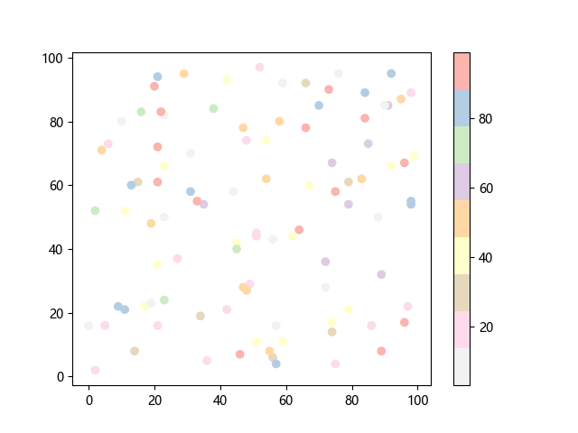 # 这三行代码使编译器能够绘图: import sys import matplotlib matplotlib.use('Agg') import matplotlib.pyplot as plt import numpy as np x = np.random.randint(100, size=(100)) y = np.random.randint(100, size=(100)) colors = np.random.randint(100, size=(100)) # 绘制反向 Pastel1 配色方案的散点图: plt.scatter(x, y, c=colors, cmap='Pastel1_r') plt.colorbar() plt.show() # 这两行代码使编译器能够输出图形: plt.savefig(sys.stdout.buffer) sys.stdout.flush()