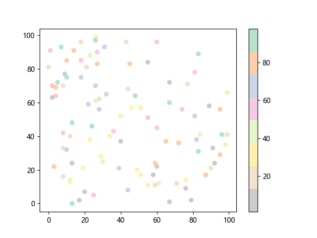 # 这三行代码使编译器能够绘图: import sys import matplotlib matplotlib.use('Agg') import matplotlib.pyplot as plt import numpy as np # 生成 100 个随机 x 坐标: x = np.random.randint(100, size=(100)) # 生成 100 个随机 y 坐标: y = np.random.randint(100, size=(100)) # 生成 100 个随机颜色值: colors = np.random.randint(100, size=(100)) # 绘制彩色散点图 plt.scatter(x, y, c=colors, cmap='Pastel2_r') plt.colorbar() # 显示颜色条 plt.show() # 显示图形 # 这两行代码使编译器能够输出图形: plt.savefig(sys.stdout.buffer) sys.stdout.flush()