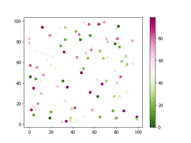 # 这三行代码使编译器能够绘图: import sys import matplotlib matplotlib.use('Agg') import matplotlib.pyplot as plt import numpy as np # 生成随机数据: x = np.random.randint(100, size=(100)) y = np.random.randint(100, size=(100)) colors = np.random.randint(100, size=(100)) # 使用 PiYG_r 配色方案绘制粉绿反向渐变色散点图: plt.scatter(x, y, c=colors, cmap='PiYG_r') plt.colorbar() # 显示颜色条 plt.show() # 显示图形 # 这两行代码使编译器能够输出图形: plt.savefig(sys.stdout.buffer) sys.stdout.flush()