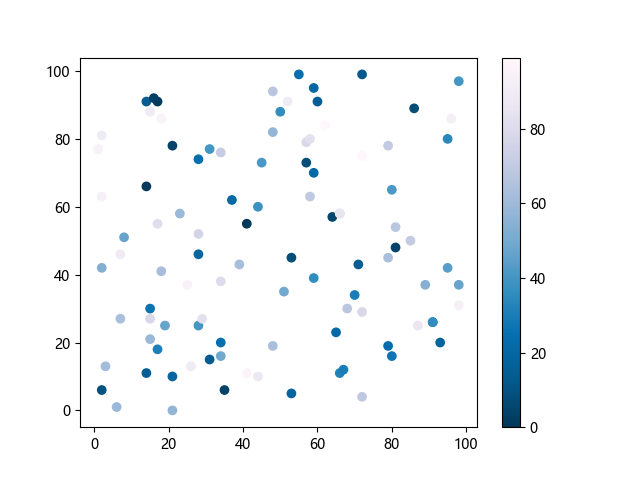 # 这三行代码使编译器能够绘图: import sys import matplotlib matplotlib.use('Agg') import matplotlib.pyplot as plt import numpy as np # 生成随机数据: x = np.random.randint(100, size=(100)) y = np.random.randint(100, size=(100)) colors = np.random.randint(100, size=(100)) # 使用 PuBu_r 配色方案绘制紫蓝色反向渐变色散点图: plt.scatter(x, y, c=colors, cmap='PuBu_r') plt.colorbar() # 显示颜色条 plt.show() # 显示图形 # 这两行代码使编译器能够输出图形: plt.savefig(sys.stdout.buffer) sys.stdout.flush()