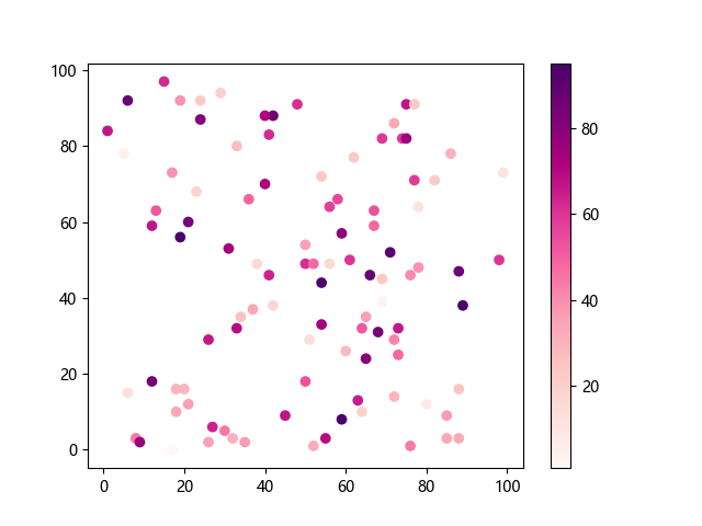 # 这三行代码使编译器能够绘图: import sys import matplotlib matplotlib.use('Agg') import matplotlib.pyplot as plt import numpy as np # 生成随机数据 x = np.random.randint(100, size=(100)) y = np.random.randint(100, size=(100)) colors = np.random.randint(100, size=(100)) # 使用 RdPu 配色方案绘制红紫色渐变色散点图: plt.scatter(x, y, c=colors, cmap='RdPu') plt.colorbar() # 显示颜色条 plt.show() # 显示图形 # 这两行代码使编译器能够输出图形: plt.savefig(sys.stdout.buffer) sys.stdout.flush()