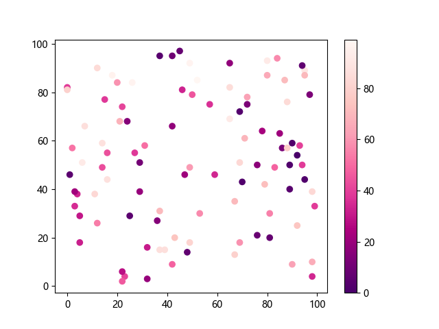 # 这三行代码使编译器能够绘图: import sys import matplotlib matplotlib.use('Agg') import matplotlib.pyplot as plt import numpy as np # 生成随机数据: x = np.random.randint(100, size=(100)) y = np.random.randint(100, size=(100)) colors = np.random.randint(100, size=(100)) # 使用 RdPu_r 配色方案绘制红紫色反向渐变色散点图: plt.scatter(x, y, c=colors, cmap='RdPu_r') plt.colorbar() # 显示颜色条 plt.show() # 显示图形 # 这两行代码使编译器能够输出图形: plt.savefig(sys.stdout.buffer) sys.stdout.flush()