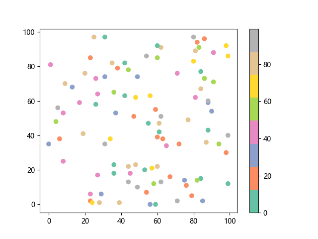 # 这三行代码使编译器能够绘图: import sys import matplotlib matplotlib.use('Agg') import matplotlib.pyplot as plt import numpy as np # 生成随机数据: x = np.random.randint(100, size=(100)) y = np.random.randint(100, size=(100)) colors = np.random.randint(100, size=(100)) # 使用 Set2 (8 色调色板)配色方案绘制 Set2 离散色散点图: plt.scatter(x, y, c=colors, cmap='Set2') plt.colorbar() # 显示颜色条 plt.show() # 显示图形 # 这两行代码使编译器能够输出图形: plt.savefig(sys.stdout.buffer) sys.stdout.flush()