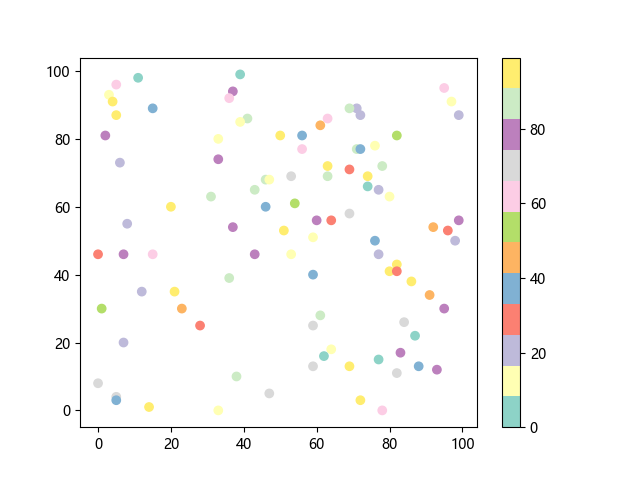 # 这三行代码使编译器能够绘图: import sys import matplotlib matplotlib.use('Agg') import matplotlib.pyplot as plt import numpy as np # 生成随机数据: x = np.random.randint(100, size=(100)) y = np.random.randint(100, size=(100)) colors = np.random.randint(100, size=(100)) # 使用 Set3 (12 色调色板)配色方案绘制 Set3 离散色散点图: plt.scatter(x, y, c=colors, cmap='Set3') plt.colorbar() # 显示颜色条 plt.show() # 显示图形 # 这两行代码使编译器能够输出图形: plt.savefig(sys.stdout.buffer) sys.stdout.flush()