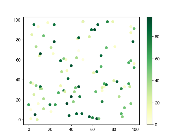 # 这三行代码使编译器能够绘图: import sys import matplotlib matplotlib.use('Agg') import matplotlib.pyplot as plt import numpy as np # 生成随机数据: x = np.random.randint(100, size=(100)) y = np.random.randint(100, size=(100)) colors = np.random.randint(100, size=(100)) # 使用 YlGn (黄-绿渐变)配色方案绘制散点图: plt.scatter(x, y, c=colors, cmap='YlGn') plt.colorbar() # 显示颜色条 plt.show() # 显示图形 # 这两行代码使编译器能够输出图形: plt.savefig(sys.stdout.buffer) sys.stdout.flush()