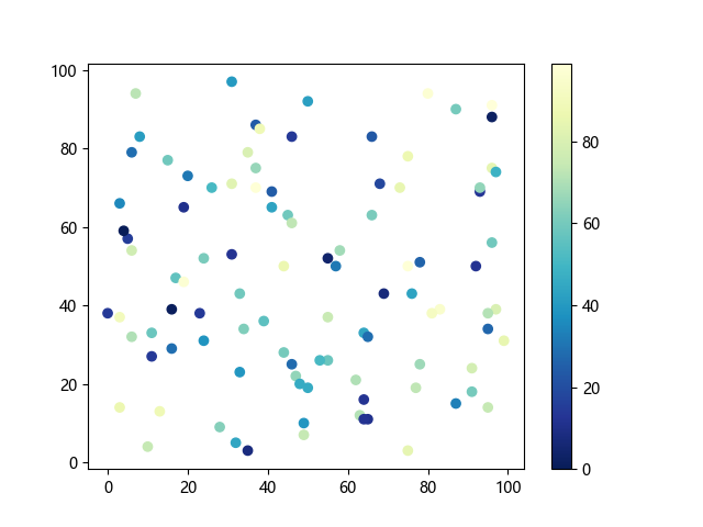 # 这三行代码使编译器能够绘图: import sys import matplotlib matplotlib.use('Agg') import matplotlib.pyplot as plt import numpy as np # 生成随机数据点: x = np.random.randint(100, size=(100)) y = np.random.randint(100, size=(100)) colors = np.random.randint(100, size=(100)) # 使用 YlGnBu_r (黄-绿-蓝反向渐变)配色方案绘制散点图: plt.scatter(x, y, c=colors, cmap='YlGnBu_r') plt.colorbar() # 显示颜色条 plt.show() # 显示图形 # 这两行代码使编译器能够输出图形: plt.savefig(sys.stdout.buffer) sys.stdout.flush()