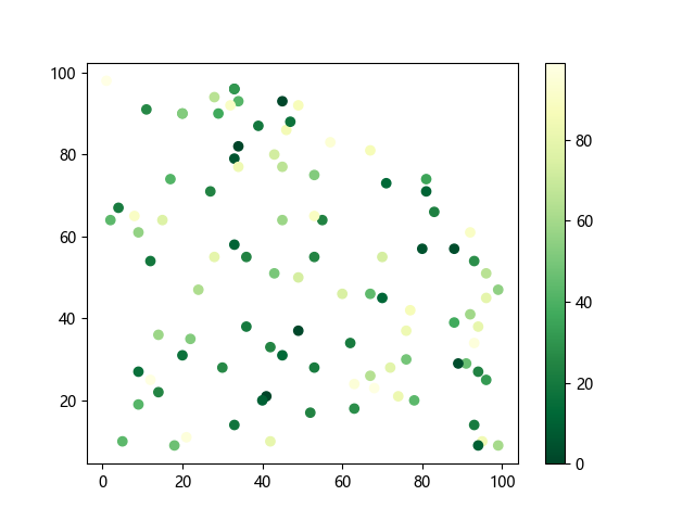 # 这三行代码使编译器能够绘图: import sys import matplotlib matplotlib.use('Agg') import matplotlib.pyplot as plt import numpy as np # 生成随机数据: x = np.random.randint(100, size=(100)) y = np.random.randint(100, size=(100)) colors = np.random.randint(100, size=(100)) # 使用YlGn_r(黄-绿反向渐变)配色方案绘制散点图: plt.scatter(x, y, c=colors, cmap='YlGn_r') plt.colorbar() # 显示颜色条 plt.show() # 显示图形 # 这两行代码使编译器能够输出图形: plt.savefig(sys.stdout.buffer) sys.stdout.flush()