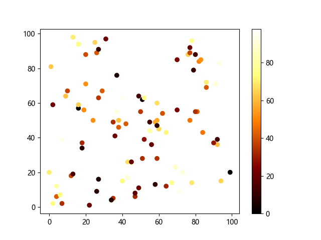 # 这三行代码使编译器能够绘图: import sys import matplotlib matplotlib.use('Agg') import matplotlib.pyplot as plt import numpy as np # 生成随机数据: x = np.random.randint(100, size=(100)) y = np.random.randint(100, size=(100)) colors = np.random.randint(100, size=(100)) # 使用 afmhot (热金属)配色方案绘制热金属色散点图: plt.scatter(x, y, c=colors, cmap='afmhot') plt.colorbar() # 显示颜色条 plt.show() # 显示图形 # 这两行代码使编译器能够输出图形: plt.savefig(sys.stdout.buffer) sys.stdout.flush()