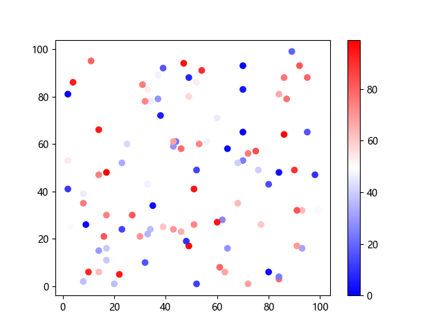 # 这三行代码使编译器能够绘图: import sys import matplotlib matplotlib.use('Agg') import matplotlib.pyplot as plt import numpy as np # 生成随机数据 x = np.random.randint(100, size=(100)) y = np.random.randint(100, size=(100)) colors = np.random.randint(100, size=(100)) # 使用 bwr 配色方案绘制蓝白红渐变色散点图: plt.scatter(x, y, c=colors, cmap='bwr') plt.colorbar() plt.show() # 这两行代码使编译器能够输出图形: plt.savefig(sys.stdout.buffer) sys.stdout.flush()