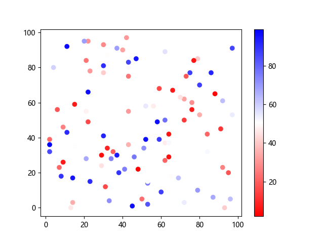 # 这三行代码使编译器能够绘图: import sys import matplotlib matplotlib.use('Agg') import matplotlib.pyplot as plt import numpy as np # 生成随机数据点 x = np.random.randint(100, size=(100)) y = np.random.randint(100, size=(100)) colors = np.random.randint(100, size=(100)) # 使用 bwr_r 配色方案绘制蓝白红反向渐变色散点图: plt.scatter(x, y, c=colors, cmap='bwr_r') plt.colorbar() plt.show() # 这两行代码使编译器能够输出图形: plt.savefig(sys.stdout.buffer) sys.stdout.flush()