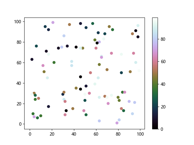 # 这三行代码使编译器能够绘图: import sys import matplotlib matplotlib.use('Agg') import matplotlib.pyplot as plt import numpy as np # 生成随机数据 x = np.random.randint(100, size=(100)) y = np.random.randint(100, size=(100)) colors = np.random.randint(100, size=(100)) # 使用 cubehelix 配色方案绘制螺旋立方体渐变色散点图: plt.scatter(x, y, c=colors, cmap='cubehelix') plt.colorbar() plt.show() # 这两行代码使编译器能够输出图形: plt.savefig(sys.stdout.buffer) sys.stdout.flush()