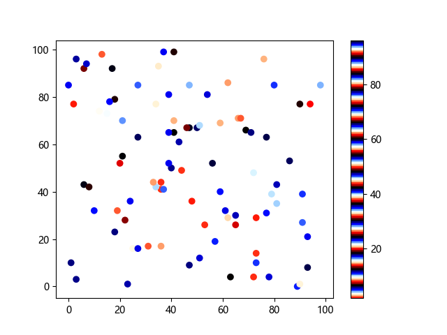 # 这三行代码使编译器能够绘图: import sys import matplotlib matplotlib.use('Agg') import matplotlib.pyplot as plt import numpy as np # 生成随机数据 x = np.random.randint(100, size=(100)) y = np.random.randint(100, size=(100)) colors = np.random.randint(100, size=(100)) # 使用 flag 配色方案绘制旗帜渐变色散点图: plt.scatter(x, y, c=colors, cmap='flag') plt.colorbar() plt.show() # 这两行代码使编译器能够输出图形: plt.savefig(sys.stdout.buffer) sys.stdout.flush()