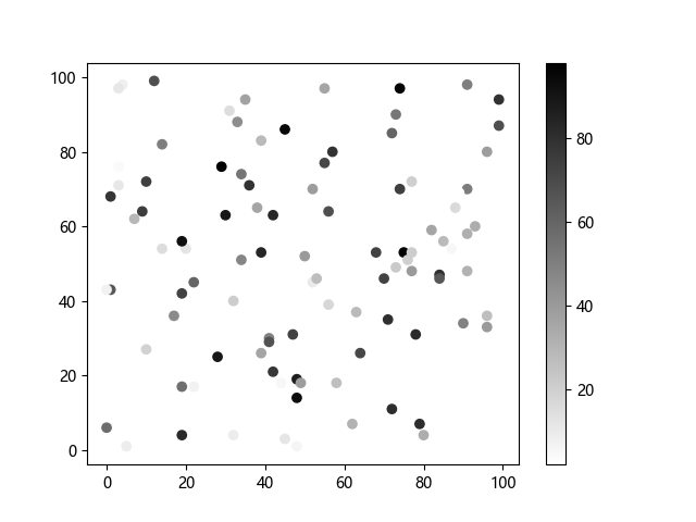 # 这三行代码使编译器能够绘图: import sys import matplotlib matplotlib.use('Agg') import matplotlib.pyplot as plt import numpy as np # 生成随机数据点 x = np.random.randint(100, size=(100)) y = np.random.randint(100, size=(100)) colors = np.random.randint(100, size=(100)) # 使用 gist_gray_r 配色方案绘制灰度反向渐变色散点图: plt.scatter(x, y, c=colors, cmap='gist_gray_r') plt.colorbar() plt.show() # 这两行代码使编译器能够输出图形: plt.savefig(sys.stdout.buffer) sys.stdout.flush()