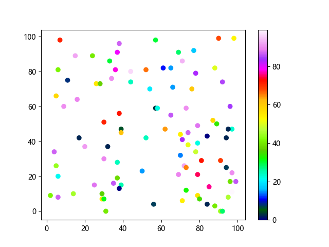# 这三行代码使编译器能够绘图: import sys import matplotlib matplotlib.use('Agg') import matplotlib.pyplot as plt import numpy as np # 生成随机数据 x = np.random.randint(100, size=(100)) y = np.random.randint(100, size=(100)) colors = np.random.randint(100, size=(100)) # 使用 gist_ncar 配色方案绘制NCAR渐变色散点图: plt.scatter(x, y, c=colors, cmap='gist_ncar') plt.colorbar() plt.show() # 这两行代码使编译器能够输出图形: plt.savefig(sys.stdout.buffer) sys.stdout.flush()