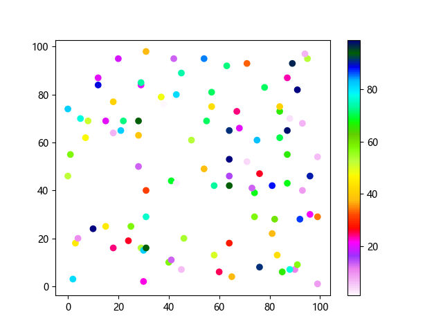 # 这三行代码使编译器能够绘图: import sys import matplotlib matplotlib.use('Agg') import matplotlib.pyplot as plt import numpy as np # 生成随机数据点 x = np.random.randint(100, size=(100)) y = np.random.randint(100, size=(100)) colors = np.random.randint(100, size=(100)) # 使用 gist_ncar_r 配色方案绘制 NCAR 反向渐变色散点图: plt.scatter(x, y, c=colors, cmap='gist_ncar_r') plt.colorbar() plt.show() # 这两行代码使编译器能够输出图形: plt.savefig(sys.stdout.buffer) sys.stdout.flush()