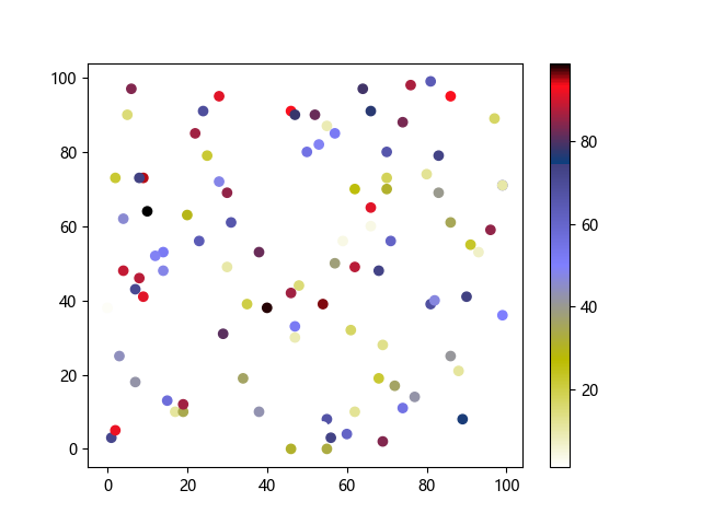 # 这三行代码使编译器能够绘图: import sys import matplotlib matplotlib.use('Agg') import matplotlib.pyplot as plt import numpy as np # 生成随机数据点 x = np.random.randint(100, size=(100)) y = np.random.randint(100, size=(100)) colors = np.random.randint(100, size=(100)) # 使用 gist_stern_r 配色方案绘制星云反向渐变色散点图: plt.scatter(x, y, c=colors, cmap='gist_stern_r') plt.colorbar() plt.show() # 这两行代码使编译器能够输出图形: plt.savefig(sys.stdout.buffer) sys.stdout.flush()