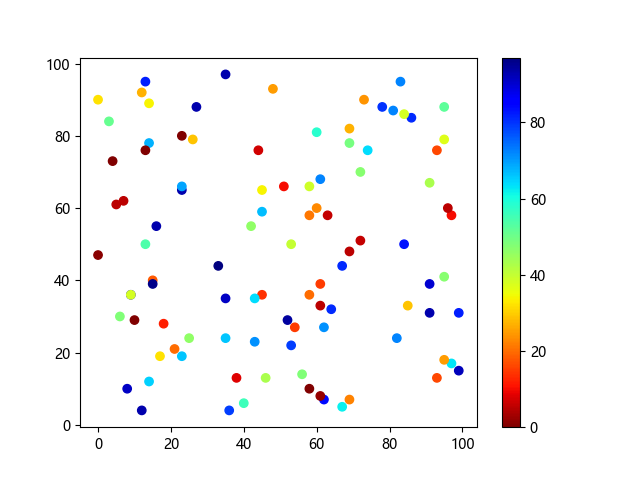 # 这三行代码使编译器能够绘图: import sys import matplotlib matplotlib.use('Agg') import matplotlib.pyplot as plt import numpy as np # 生成随机数据点 x = np.random.randint(100, size=(100)) y = np.random.randint(100, size=(100)) colors = np.random.randint(100, size=(100)) # 使用 jet_r 配色方案绘制 Jet 反向渐变色散点图: plt.scatter(x, y, c=colors, cmap='jet_r') plt.colorbar() plt.show() # 这两行代码使编译器能够输出图形: plt.savefig(sys.stdout.buffer) sys.stdout.flush()