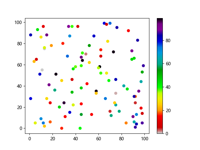 #Three lines to make our compiler able to draw: import sys import matplotlib matplotlib.use('Agg') import matplotlib.pyplot as plt import numpy as np x = np.random.randint(100, size=(100)) y = np.random.randint(100, size=(100)) colors = np.random.randint(100, size=(100)) plt.scatter(x, y, c=colors, cmap='nipy_spectral_r') plt.colorbar() plt.show() #Two lines to make our compiler able to draw: plt.savefig(sys.stdout.buffer) sys.stdout.flush()