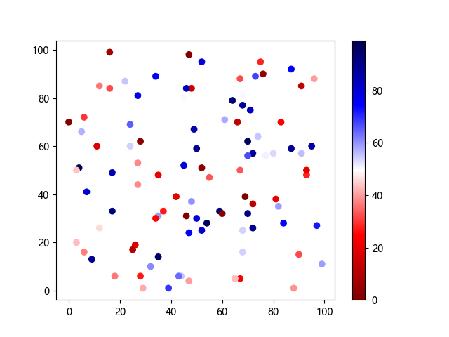 # 以下三行代码使编译器支持绘图功能: import sys import matplotlib matplotlib.use('Agg') import matplotlib.pyplot as plt import numpy as np # 生成随机数据: x = np.random.randint(100, size=(100)) y = np.random.randint(100, size=(100)) colors = np.random.randint(100, size=(100)) # 使用 seismic 反向配色方案创建散点图: plt.scatter(x, y, c=colors, cmap='seismic_r') plt.colorbar() plt.show() # 以下两行代码使编译器能够输出图形: plt.savefig(sys.stdout.buffer) sys.stdout.flush()