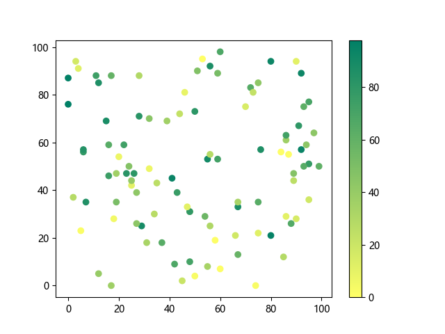 # 以下三行代码使编译器支持绘图功能: import sys import matplotlib matplotlib.use('Agg') import matplotlib.pyplot as plt import numpy as np # 生成随机数据: x = np.random.randint(100, size=(100)) y = np.random.randint(100, size=(100)) colors = np.random.randint(100, size=(100)) # 使用 summer 反向配色方案创建散点图: plt.scatter(x, y, c=colors, cmap='summer_r') plt.colorbar() plt.show() # 以下两行代码使编译器能够输出图形: plt.savefig(sys.stdout.buffer) sys.stdout.flush()