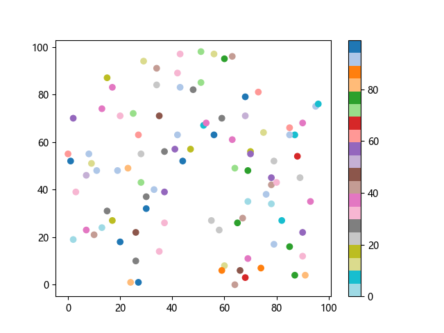 # 以下三行代码使编译器支持绘图功能: import sys import matplotlib matplotlib.use('Agg') import matplotlib.pyplot as plt import numpy as np # 生成随机数据: x = np.random.randint(100, size=(100)) y = np.random.randint(100, size=(100)) colors = np.random.randint(100, size=(100)) # 使用 tab20 反向离散配色方案创建散点图: plt.scatter(x, y, c=colors, cmap='tab20_r') plt.colorbar() plt.show() # 以下两行代码使编译器能够输出图形: plt.savefig(sys.stdout.buffer) sys.stdout.flush()