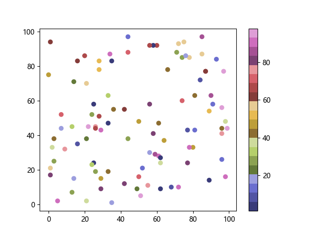 # 以下三行代码使编译器支持绘图功能: import sys import matplotlib matplotlib.use('Agg') import matplotlib.pyplot as plt import numpy as np # 生成随机数据: x = np.random.randint(100, size=(100)) y = np.random.randint(100, size=(100)) colors = np.random.randint(100, size=(100)) # 使用 tab20b 离散配色方案创建散点图: plt.scatter(x, y, c=colors, cmap='tab20b') plt.colorbar() plt.show() # 以下两行代码使编译器能够输出图形: plt.savefig(sys.stdout.buffer) sys.stdout.flush()