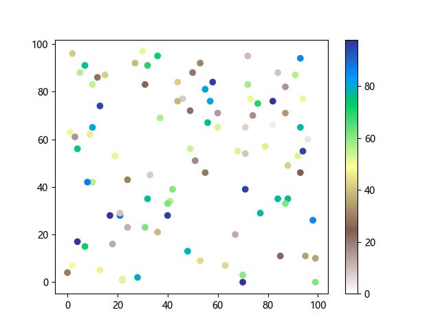 # 以下三行代码使编译器支持绘图功能: import sys import matplotlib matplotlib.use('Agg') import matplotlib.pyplot as plt import numpy as np # 生成随机数据: x = np.random.randint(100, size=(100)) y = np.random.randint(100, size=(100)) colors = np.random.randint(100, size=(100)) # 使用地形反向 (terrain_r) 配色方案创建散点图: plt.scatter(x, y, c=colors, cmap='terrain_r') plt.colorbar() plt.show() # 以下两行代码使编译器能够输出图形: plt.savefig(sys.stdout.buffer) sys.stdout.flush()