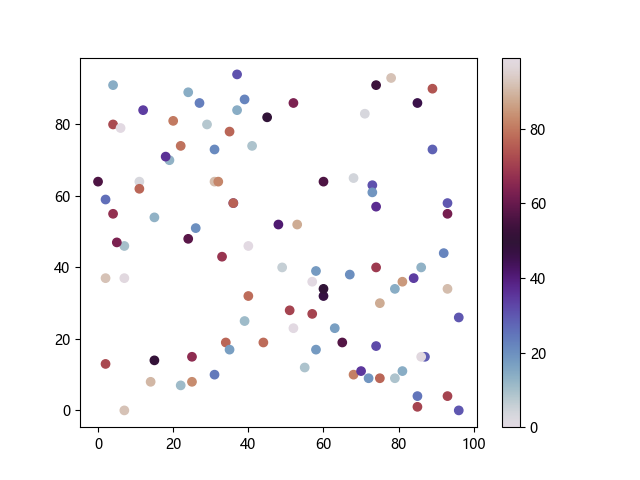 # 以下三行代码使编译器支持绘图功能: import sys import matplotlib matplotlib.use('Agg') import matplotlib.pyplot as plt import numpy as np # 生成随机数据: x = np.random.randint(100, size=(100)) y = np.random.randint(100, size=(100)) colors = np.random.randint(100, size=(100)) # 使用 twilight 配色方案创建散点图: plt.scatter(x, y, c=colors, cmap='twilight') plt.colorbar() plt.show() # 以下两行代码使编译器能够输出图形: plt.savefig(sys.stdout.buffer) sys.stdout.flush()