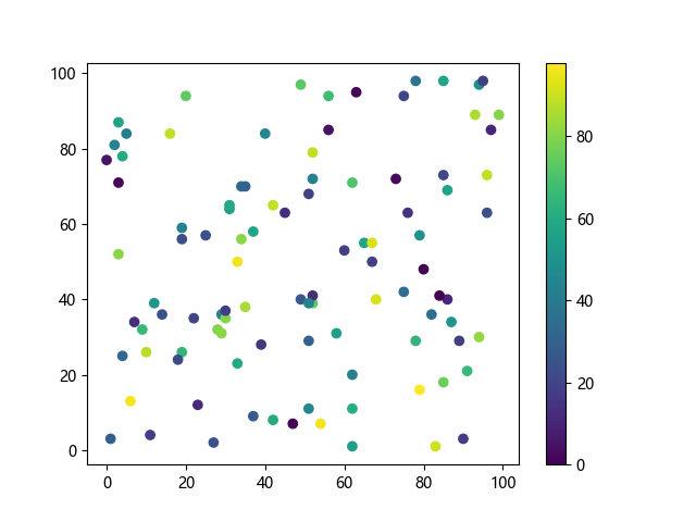 # 以下三行代码使编译器支持绘图功能: import sys import matplotlib matplotlib.use('Agg') import matplotlib.pyplot as plt import numpy as np # 生成随机数据: x = np.random.randint(100, size=(100)) y = np.random.randint(100, size=(100)) colors = np.random.randint(100, size=(100)) # 使用 viridis 配色方案创建散点图: plt.scatter(x, y, c=colors, cmap='viridis') plt.colorbar() plt.show() # 以下两行代码使编译器能够输出图形: plt.savefig(sys.stdout.buffer) sys.stdout.flush()