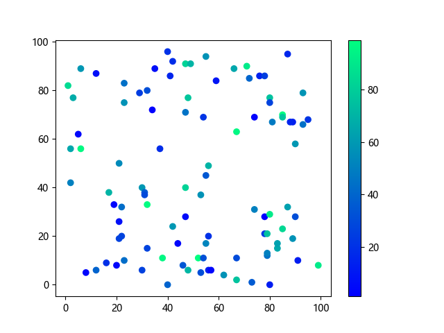 # 以下三行代码使编译器支持绘图功能: import sys import matplotlib matplotlib.use('Agg') import matplotlib.pyplot as plt import numpy as np # 生成随机数据: x = np.random.randint(100, size=(100)) y = np.random.randint(100, size=(100)) colors = np.random.randint(100, size=(100)) # 使用冬季 (winter) 配色方案创建散点图: plt.scatter(x, y, c=colors, cmap='winter') plt.colorbar() plt.show() # 以下两行代码使编译器能够输出图形: plt.savefig(sys.stdout.buffer) sys.stdout.flush()
