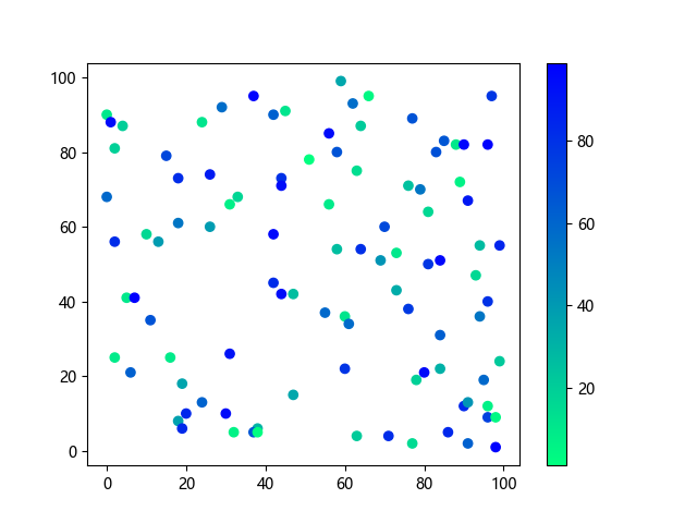 # 以下三行代码使编译器支持绘图功能: import sys import matplotlib matplotlib.use('Agg') import matplotlib.pyplot as plt import numpy as np # 生成随机数据: x = np.random.randint(100, size=(100)) y = np.random.randint(100, size=(100)) colors = np.random.randint(100, size=(100)) # 使用冬季反向 (winter_r) 配色方案创建散点图: plt.scatter(x, y, c=colors, cmap='winter_r') plt.colorbar() plt.show() # 以下两行代码使编译器能够输出图形: plt.savefig(sys.stdout.buffer) # 将图形保存到标准输出缓冲区 sys.stdout.flush() # 刷新输出缓冲区