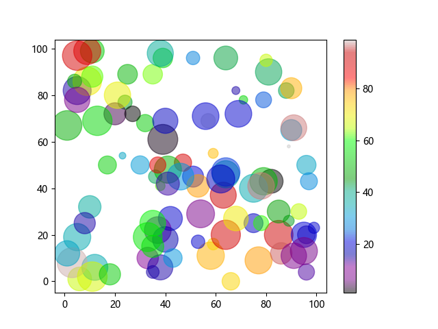 # 以下三行代码使编译器支持绘图功能: import sys import matplotlib matplotlib.use('Agg') import matplotlib.pyplot as plt import numpy as np # 生成随机数据: x = np.random.randint(100, size=(100)) y = np.random.randint(100, size=(100)) colors = np.random.randint(100, size=(100)) sizes = 10 * np.random.randint(100, size=(100)) # 点大小(10-990随机值) # 使用光谱配色、半透明效果创建散点图: plt.scatter(x, y, c=colors, s=sizes, alpha=0.5, cmap='nipy_spectral') plt.colorbar() plt.show() # 以下两行代码使编译器能够输出图形: plt.savefig(sys.stdout.buffer) sys.stdout.flush()