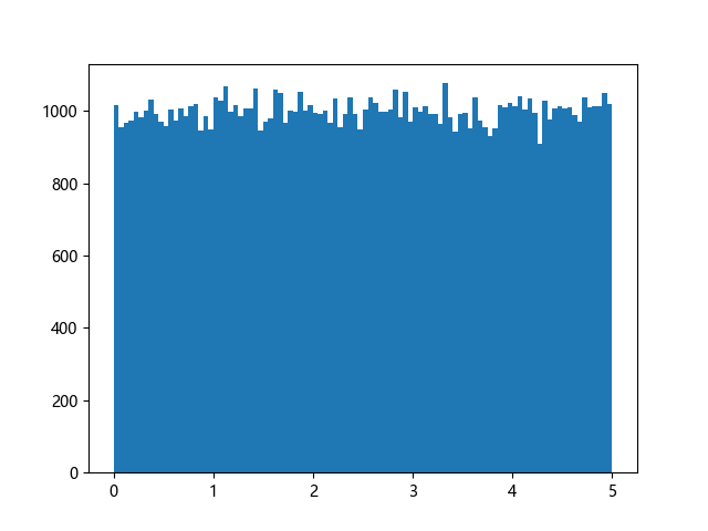 # 使编译器支持绘图的三行配置: import sys import matplotlib matplotlib.use('Agg') import numpy import matplotlib.pyplot as plt x = numpy.random.uniform(0.0, 5.0, 100000) plt.hist(x, 100) plt.show() # 实现编译器绘图功能的两行代码: plt.savefig(sys.stdout.buffer) sys.stdout.flush()